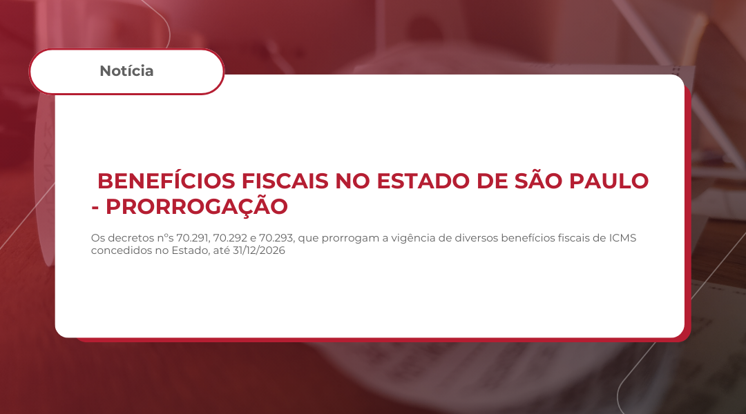 O Governo do Estado de São Paulo publicou no DOE/SP de hoje, 29/12/2025, os decretos nºs 70.291, 70.292 e 70.293, que prorrogam a vigência de diversos benefícios fiscais de ICMS concedidos no Estado, até 31/12/2026, a seguir elencados: