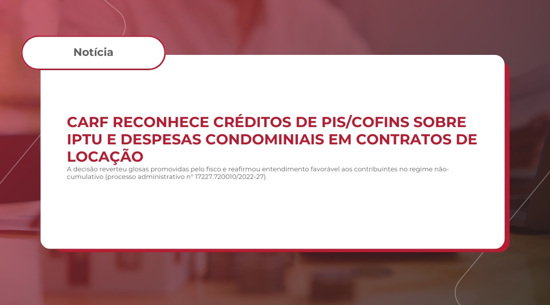 A 1ª Turma Ordinária da 1ª Câmara da 3ª Seção do Conselho Administrativo de Recursos Fiscais (CARF), órgão colegiado integrante do Ministério da Fazenda, que tem por finalidade julgar recursos administrativos referentes a tributos administrados pela Receita Federal do Brasil (RFB), por unanimidade, reconheceu o direito de uma empresa à apropriação de créditos de PIS e Cofins sobre despesas relacionadas a imóveis locados, como IPTU e taxas condominiais. A decisão reverteu glosas promovidas pelo fisco e reafirmou entendimento favorável aos contribuintes no regime não-cumulativo (processo administrativo n° 17227.720010/2022-27).