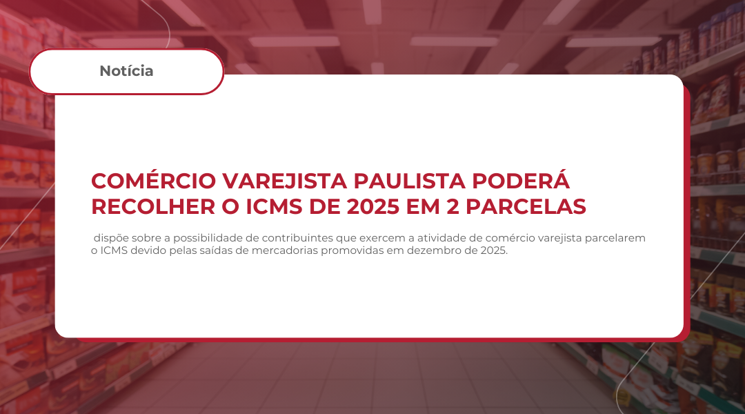 Foi publicado o Decreto nº 70.312/2025, no D.O.E. – SP de 30.12.2025, que dispõe sobre a possibilidade de contribuintes que exercem a atividade de comércio varejista parcelarem o ICMS devido pelas saídas de mercadorias promovidas em dezembro de 2025.