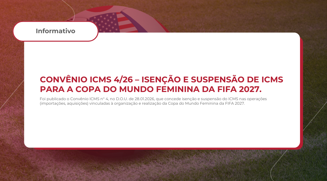 Foi publicado o Convênio ICMS n° 4, no D.O.U. de 28.01.2026, que concede isenção e suspensão do ICMS nas operações (importações, aquisições) vinculadas à organização e realização da Copa do Mundo Feminina da FIFA 2027. A medida visa desonerar bens destinados a uso ou consumo exclusivo no evento, incluindo importações por FIFA, subsidiárias e emissoras.