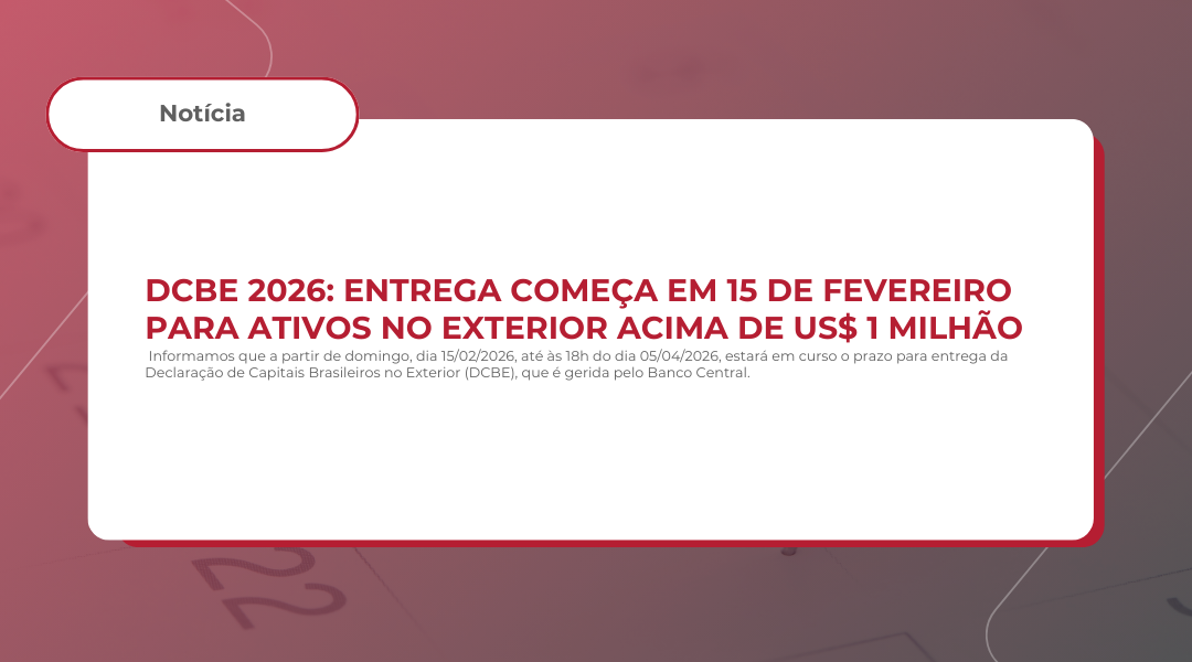 Informamos que a partir de domingo, dia 15/02/2026, até às 18h do dia 05/04/2026, estará em curso o prazo para entrega da Declaração de Capitais Brasileiros no Exterior (DCBE), que é gerida pelo Banco Central.