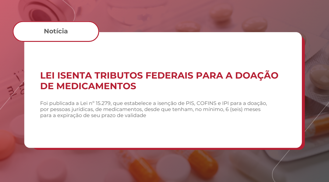 Foi publicada, no D.O.U. de 03.12.2025, a Lei nº 15.279, que estabelece a isenção de PIS, COFINS e IPI para a doação, por pessoas jurídicas, de medicamentos, desde que tenham, no mínimo, 6 (seis) meses para a expiração de seu prazo de validade, sejam utilizados sem fins lucrativos e para atividades assistenciais e provenientes de empresas ou estabelecimentos autorizados a funcionar como indústria farmacêutica.