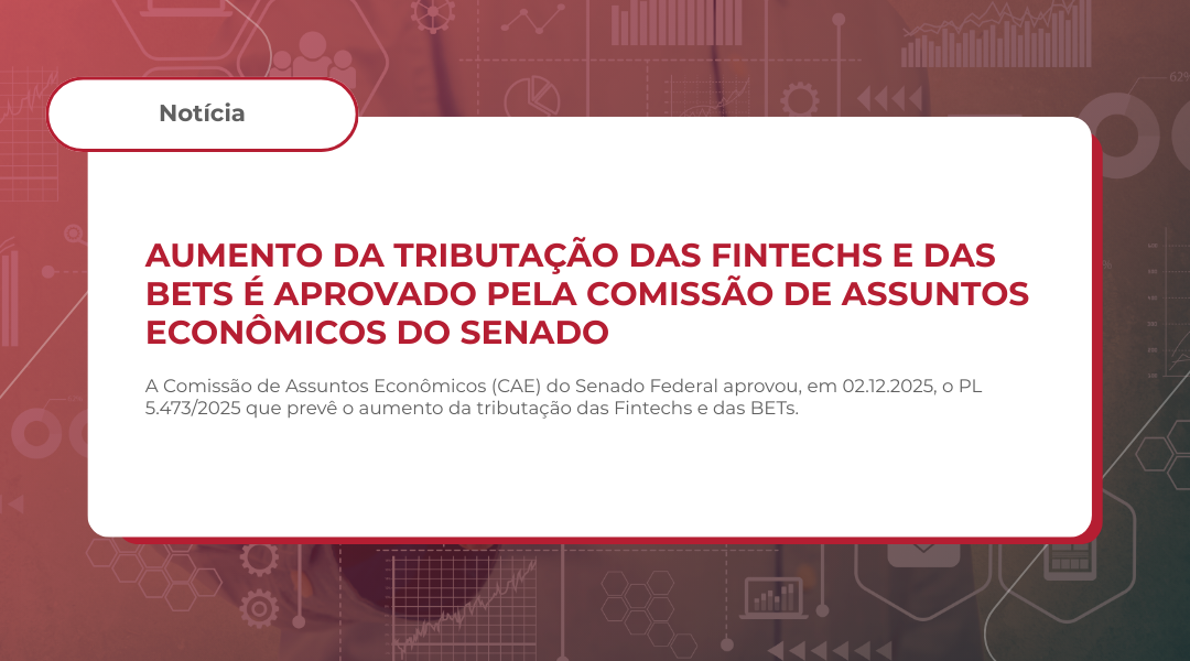 Visando compensar a perda na arrecadação com a aprovação da Lei 15.270/2025 (sanção do PL 1087/2025), que estabeleceu a isenção do Imposto de Renda Sobre Pessoa Física (IRFP) para quem ganha até R$ 5 mil, a Comissão de Assuntos Econômicos (CAE) do Senado Federal aprovou, em 02.12.2025, o Projeto de Lei (PL) 5.473/2025 que prevê o aumento da tributação das Fintechs e das apostas de quotas fixas (BETs).