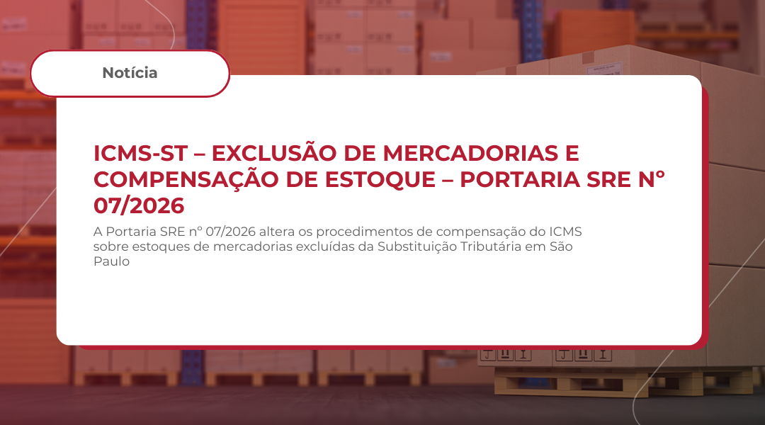 A Portaria SRE nº 07/2026, publicada no Diário Oficial do Estado de São Paulo em 13 de março de 2026, promove alteração relevante nos procedimentos de compensação do ICMS relativo ao estoque de mercadorias excluídas do regime de Substituição Tributária (ICMS‑ST).