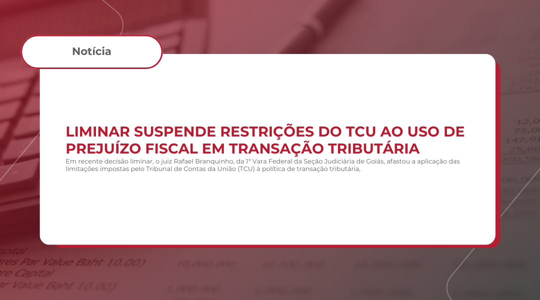Em recente decisão liminar, o juiz Rafael Branquinho, da 1ª Vara Federal da Seção Judiciária de Goiás, afastou a aplicação das limitações impostas pelo Tribunal de Contas da União (TCU) à política de transação tributária, permitindo que uma empresa utilize créditos de Prejuízo Fiscal e base negativa da CSLL nos termos originalmente previstos na legislação (Mandado de Segurança n° 1079273-45.2025.4.01.3500).