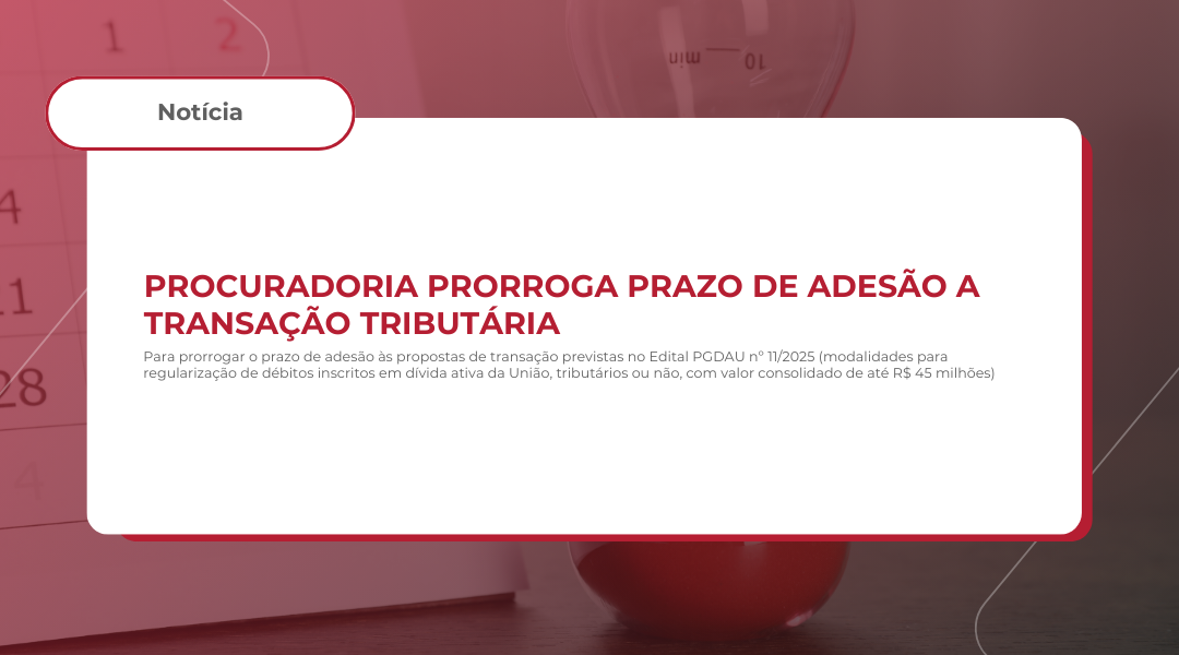 Dia 30/01/2025 foi publicado o Edital PGDAU n° 01/2026, para prorrogar o prazo de adesão às propostas de transação previstas no Edital PGDAU nº 11/2025 (modalidades para regularização de débitos inscritos em dívida ativa da União, tributários ou não, com valor consolidado de até R$ 45 milhões).