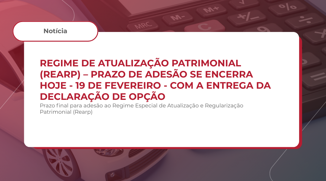 REGIME DE ATUALIZAÇÃO PATRIMONIAL (REARP) – PRAZO DE ADESÃO SE ENCERRA HOJE – 19 DE FEVEREIRO – COM A ENTREGA DA DECLARAÇÃO DE OPÇÃO