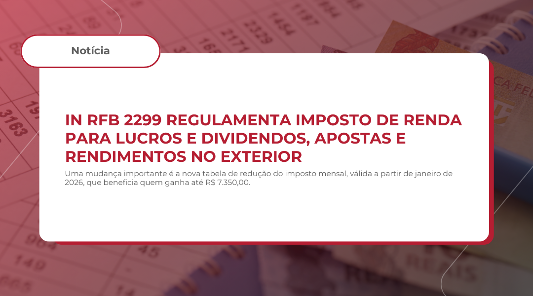 A Receita Federal publicou, em 18 de dezembro de 2025, a Instrução Normativa (IN) RFB nº 2.299, que muda as regras do Imposto de Renda das Pessoas Físicas (IRPF), com base na Lei Complementar nº 222 e nas Leis nº 15.132 e nº 15.156 editadas em 2025, e visa alinhar a norma com decisões do Ministério da Fazenda.