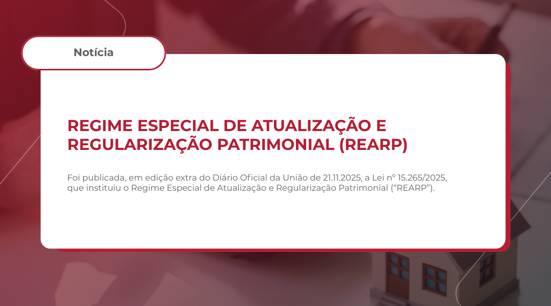 Foi publicada, em edição extra do Diário Oficial da União de 21.11.2025, a Lei nº 15.265/2025, que instituiu o Regime Especial de Atualização e Regularização Patrimonial (“REARP”), autorizando a atualização do valor de imóveis e veículos a preço de mercado no imposto de renda, desde que tenham sido adquiridos até 31.12.2024.