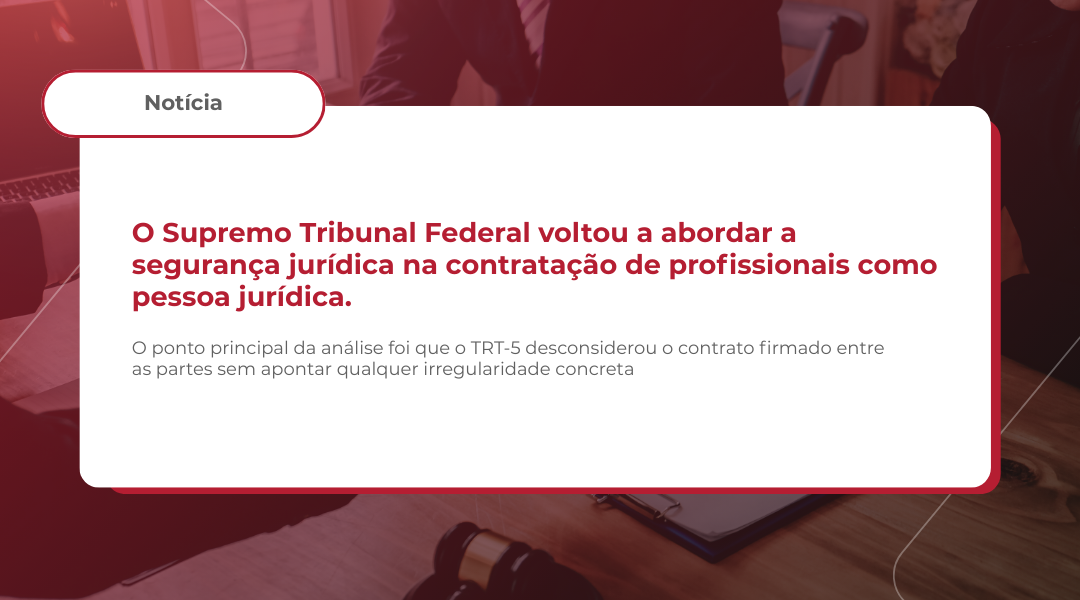O Supremo Tribunal Federal voltou a abordar a segurança jurídica na contratação de profissionais como pessoa jurídica. Em uma decisão recente, o Ministro Nunes Marques anulou um acórdão do Tribunal Regional do Trabalho da 5ª Região, que havia reconhecido vínculo empregatício entre uma empresa e um prestador contratado como PJ. Além disso, o Ministro determinou que o processo fique suspenso até que o STF conclua o julgamento do tema de repercussão geral que trata exatamente dessa discussão.