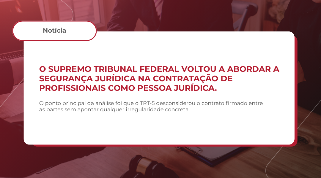 O Supremo Tribunal Federal voltou a abordar a segurança jurídica na contratação de profissionais como pessoa jurídica. Em uma decisão recente, o Ministro Nunes Marques anulou um acórdão do Tribunal Regional do Trabalho da 5ª Região, que havia reconhecido vínculo empregatício entre uma empresa e um prestador contratado como PJ. Além disso, o Ministro determinou que o processo fique suspenso até que o STF conclua o julgamento do tema de repercussão geral que trata exatamente dessa discussão.