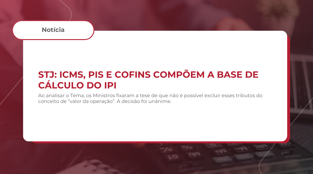 A Primeira Seção do Superior Tribunal de Justiça (STJ) decidiu, em sede de recurso repetitivo (ou seja, o entendimento deverá ser replicado por todos os demais tribunais em casos idênticos), que o ICMS, o PIS e a Cofins devem compor a base de cálculo do Imposto sobre Produtos Industrializados (IPI) – Tema n° 1.304.