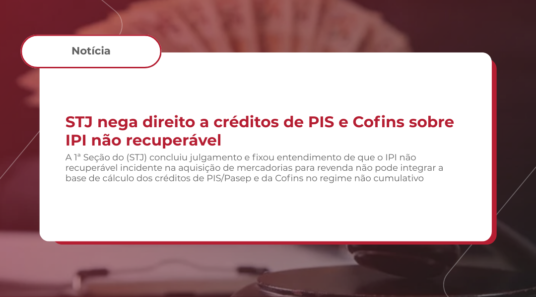 A 1ª Seção do Superior Tribunal de Justiça (STJ) concluiu julgamento sob o rito dos recursos repetitivos e fixou entendimento de que o IPI não recuperável incidente na aquisição de mercadorias para revenda não pode integrar a base de cálculo dos créditos de PIS/Pasep e da Cofins no regime não cumulativo. (Tema n° 1.373).