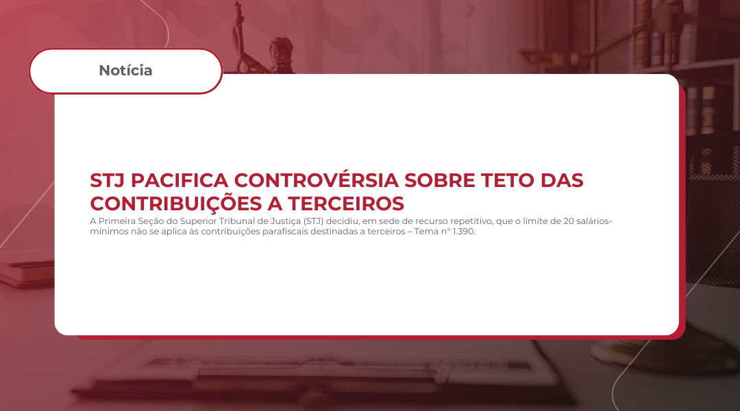 A Primeira Seção do Superior Tribunal de Justiça (STJ) decidiu, em sede de recurso repetitivo, que o limite de 20 salários-mínimos não se aplica às contribuições parafiscais destinadas a terceiros – Tema n° 1.390.